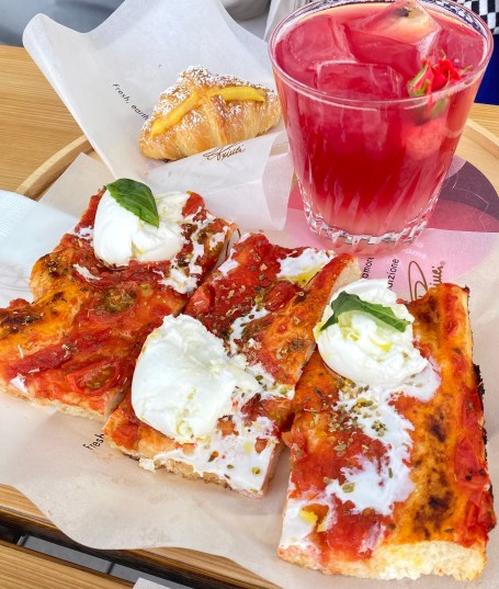 コルネッティ、フォカッチャ生地のピザ、ローズラズベリー&ライチティー
