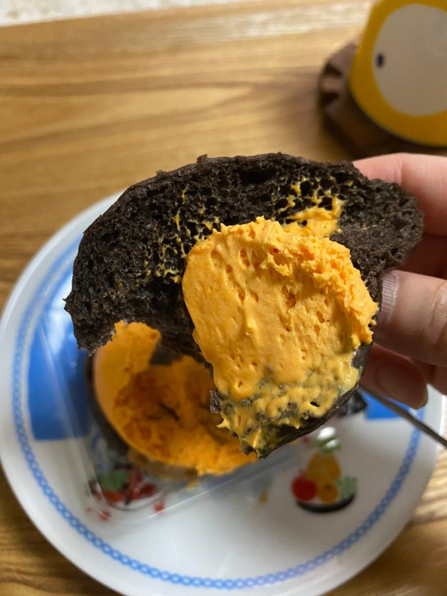 セブンイレブンの「マリトッツォパンプキン」は、黒色のブリオッシュパンに、かぼちゃ味のホイップクリームと、ほろ苦いキャラメルソースをたっぷりと詰めた、見た目からもハロウィン感が楽しめるマリトッツォです。